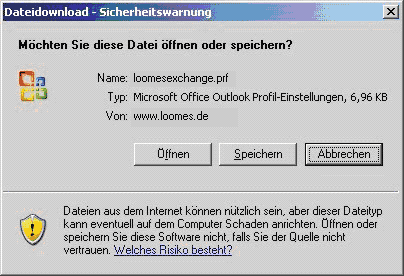 Hinweis: Falls Sie bereits ein bestehendes Outlook 2003 Profil gespeichert haben, wird dieses nicht überschrieben, sondern es wird ein zusätzliches Profil mit den Namen "Loomes" angelegt, das beim Start von Outlook 2003 automatisch ausgewählt wird. Diese Einstellung kann jederzeit über -> Systemsteuerung -> Mail -> Profile anzeigen geändert werden.