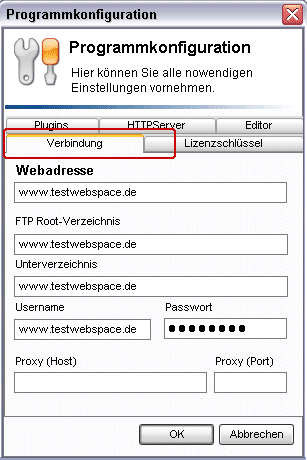 Die Angaben Webadresse, FTP-Root und Unterverzeichnis müssen jeweils Ihre Domain sein (in genau dieser Schreibweise - also www. ... ).